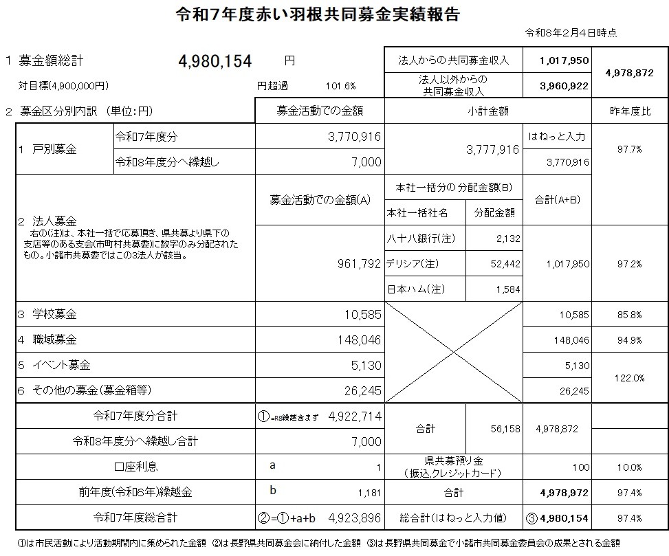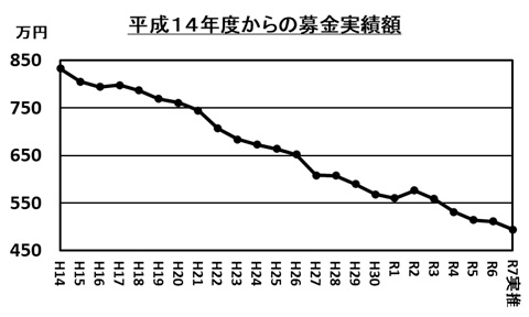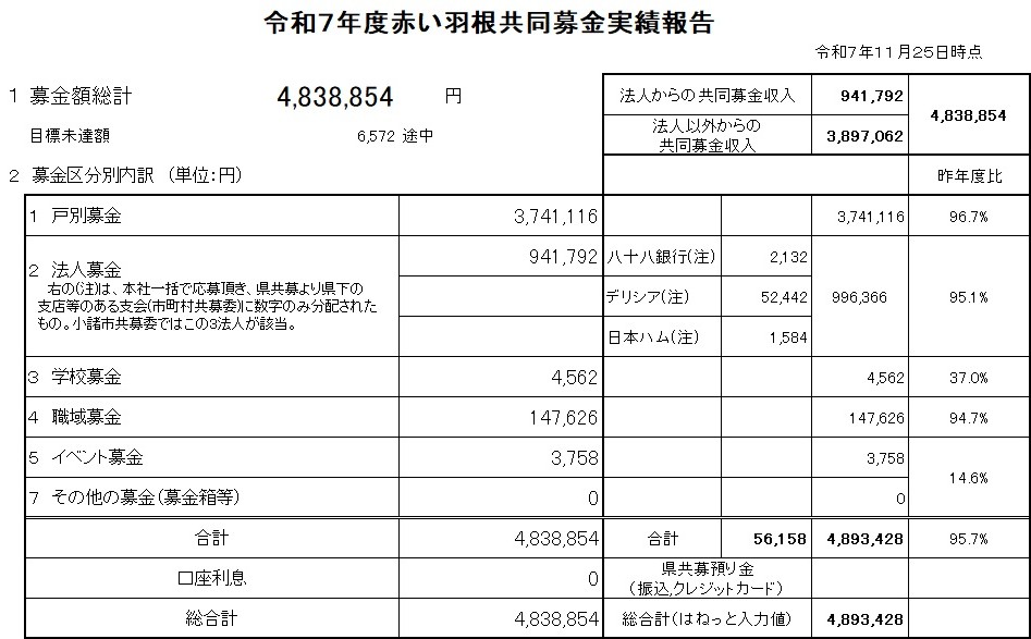 令和7年度は小諸市での各種募金合計(除く利息)、4,893,428円を頂きました(11/25時点)。誠にありがとうございました。まだ途中ではありますが、対昨年比▲218,161円(減少)95.7%、対目標比6,572円(多)99.9%です。